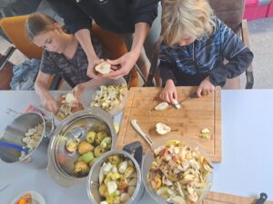 Unsere Bäume hingen voll! Dieses Jahr gibt unser Garten reichlich an uns zurück, sodass die derzeitigen Samstage für gemeinsame Stunden der sinnvollen Verwertung stehen. Alles schaffen wir nicht, ein Teil geht auch auf den Kompost, für den ist es zu spät. Aber das was wir in Teamarbeit vor Ort schaffen, bringen wir auch zu Ende! Ob Äpfel, Birnen oder Pflaumen, bei uns kam alles in den Topf, in die Tüte oder Gläser. Zubereitet für schöne Stunden der Feierlichkeit in der Henne oder für andere Tage, wo wir uns treffen. Da wir dann in der Regel fast den ganzen Tag (meistens am Wochenende zum Samstag) vor Ort sind, teilen wir auch die Mahlzeiten miteinander. In dem Moment ist es immer wieder eine Freude, die eigenen Gläser beim Öffnen <em>plobben </em>zu hören und bei den Kindern, im Kichern und Schmatzen, auch ein „Hmm schmeckt das gut!“ wahrzunehmen.