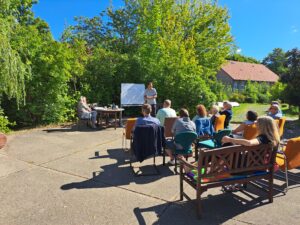 Heute hatten wir wieder ein inspirierendes Pärchen bei uns. Thorsten und Sabine, beide beschäftigen sich mit der Materie „Deutsche Sprache als immateriellen Kulturschatz“ schon sehr lange und organisieren als Team Vorträge wie den heutigen. Bei schönstem Sonnenschein an der frischen Luft konnten wir den Worten von Thorsten lauschen. Es war eine Informationsveranstaltung für einen im Herbst folgenden länger andauernden (ca. 4-5 Stunden) Vortrag.
