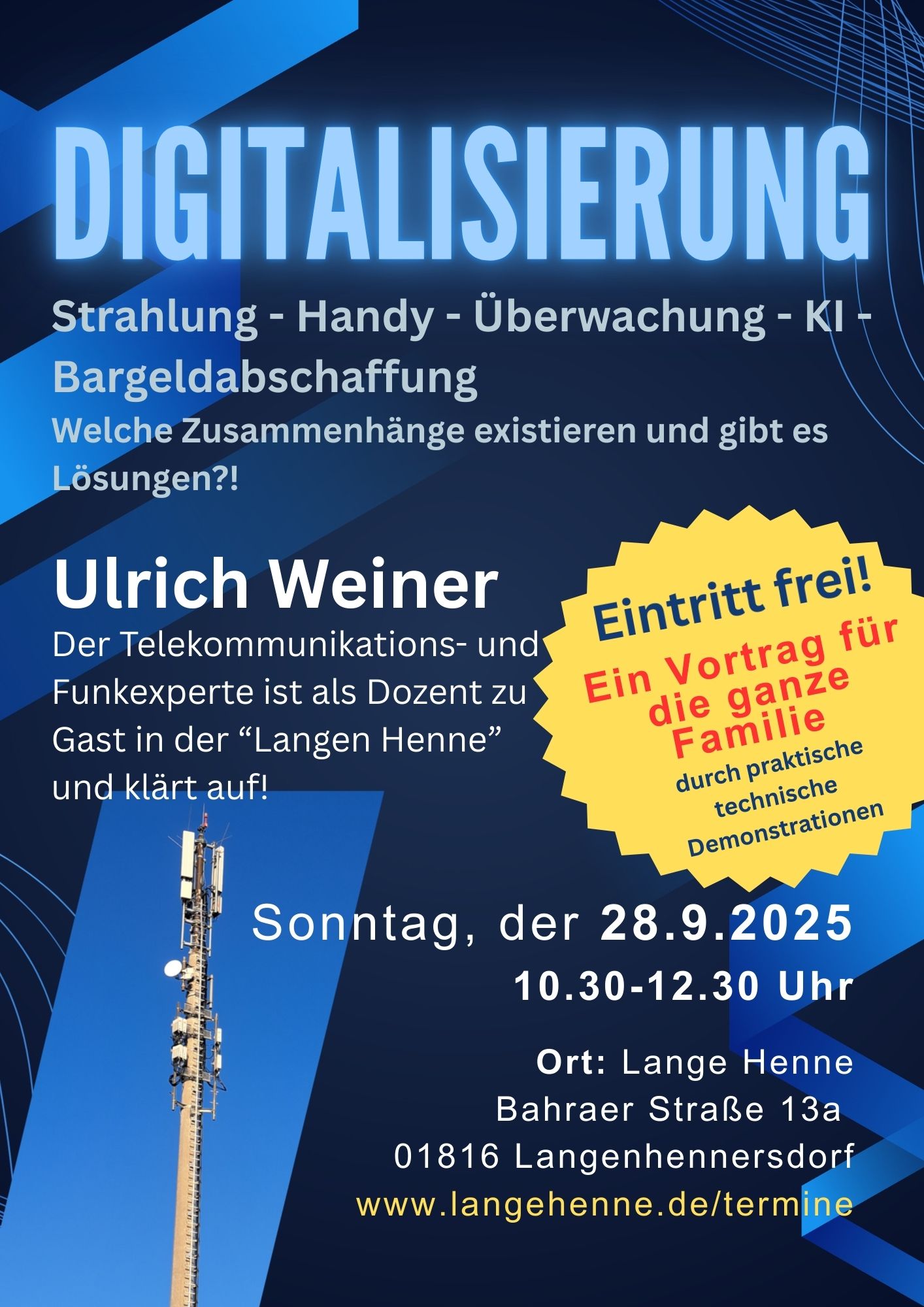 In unserem Haus wird der erfahrene Funktechniker Ulrich Weiner zu Gast sein und mit uns zwei Stunden über das Thema der Digitalisierung und seinen Gefahren dahinter sprechen. Mit 16 Jahren begann er seine Lehre zum Kommunikationselektroniker mit der Fachrichtung Funktechnik und führte mit 20 Jahren bereits einen Betrieb mit 20 Menschen im Hauptgeschäftsfeld Autotelefone, Handys, mobile Büros und ISDN-Telefonanlagen. Durch die intensive Nutzung dieser digitalen Mikrowellentechnologie ist er stark elektrohypersensitiv geworden und musste sich in die letzten strahlungsfreien Gebiete zurück ziehen. Er hat sich nun zur Aufgabe gemacht, Interessierte über diese Thematik aufzuklären und zu informieren.